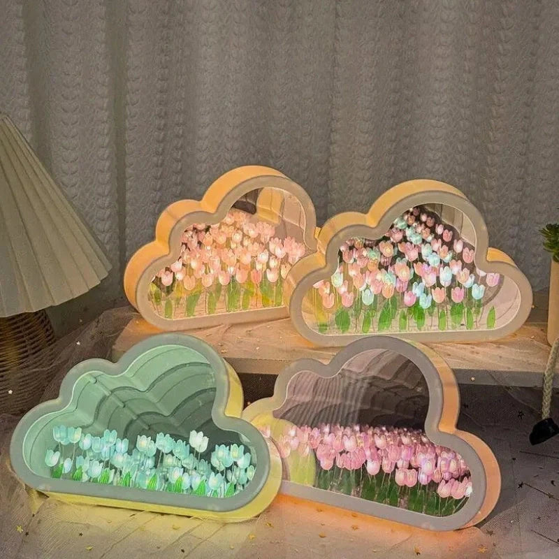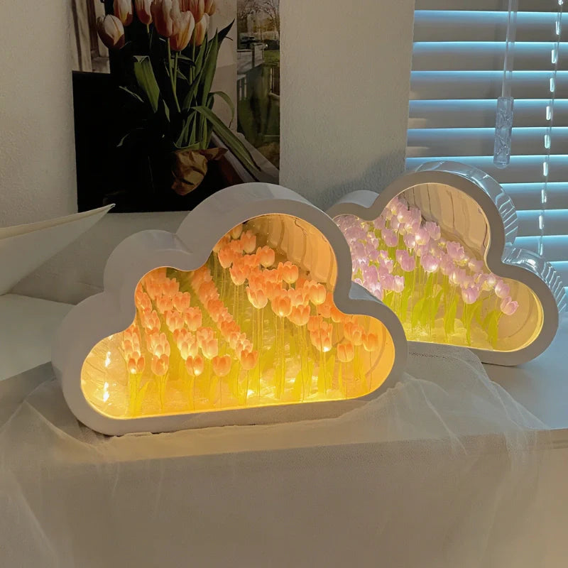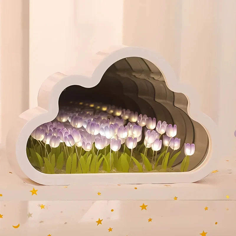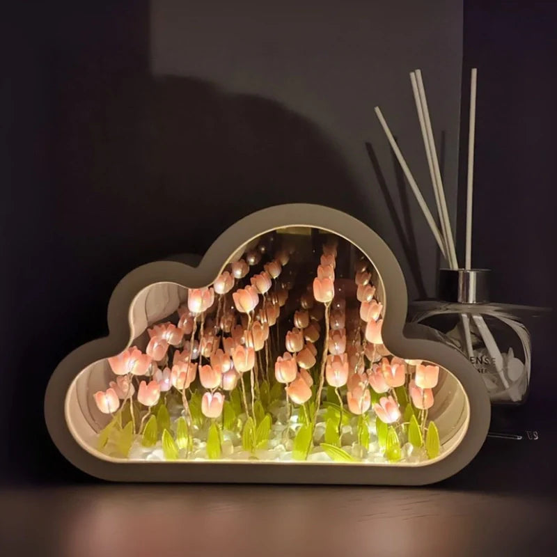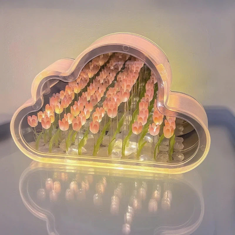 ✔️ A TIMELESS EMBRACE OF BEAUTY – Twenty glowing tulips rest beneath a cloud-shaped dome, reflected endlessly by a built-in mirror to create a serene, dreamlike garden effect.