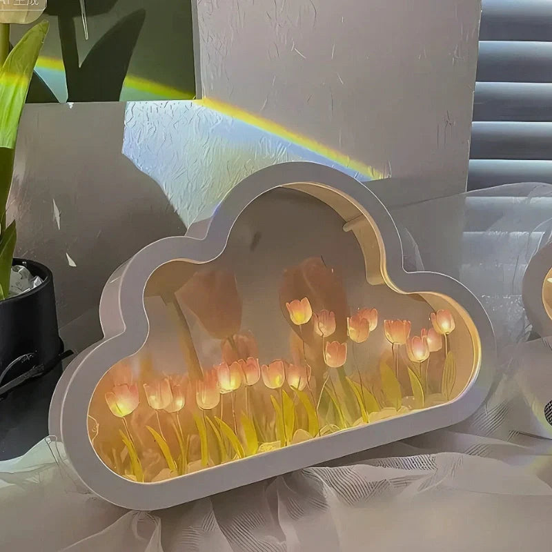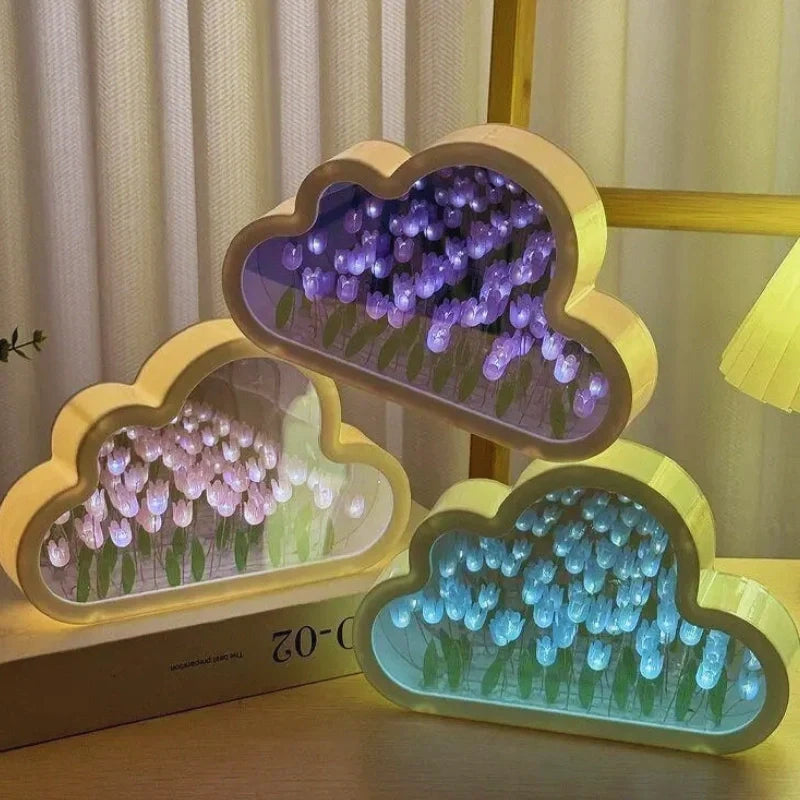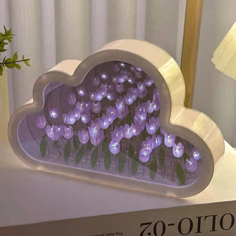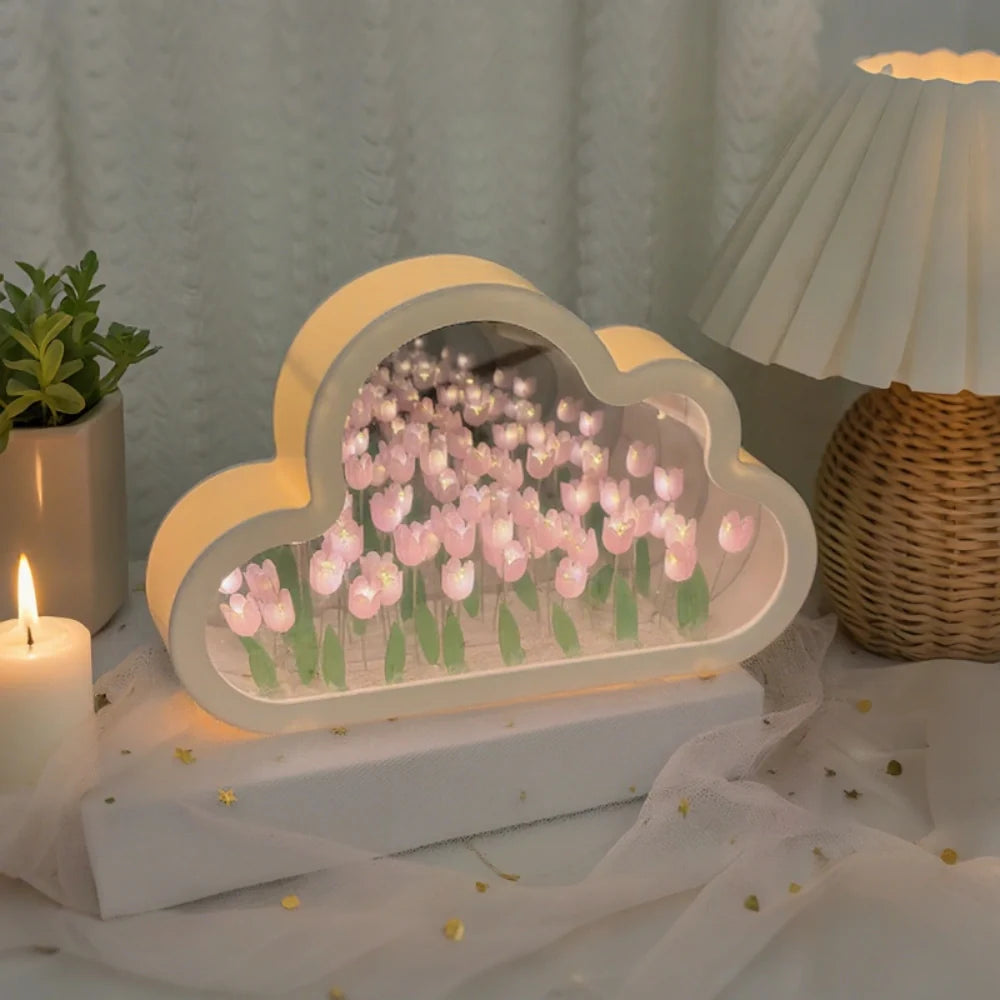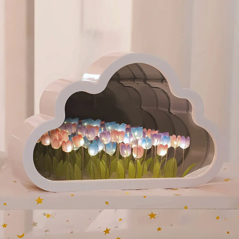 ✔️ A TIMELESS EMBRACE OF BEAUTY – Twenty glowing tulips rest beneath a cloud-shaped dome, reflected endlessly by a built-in mirror to create a serene, dreamlike garden effect.
