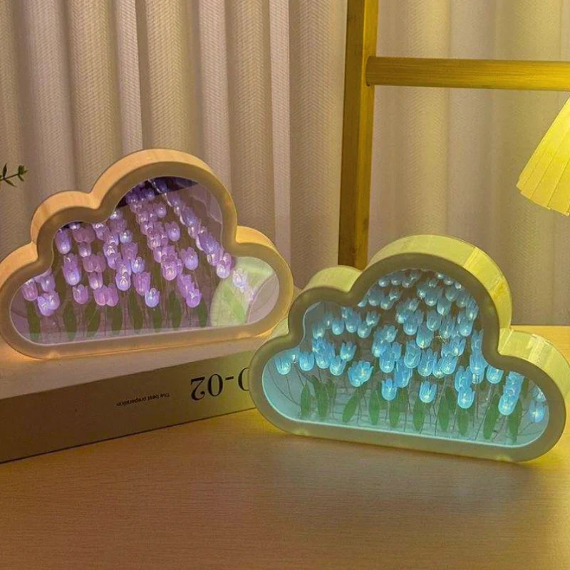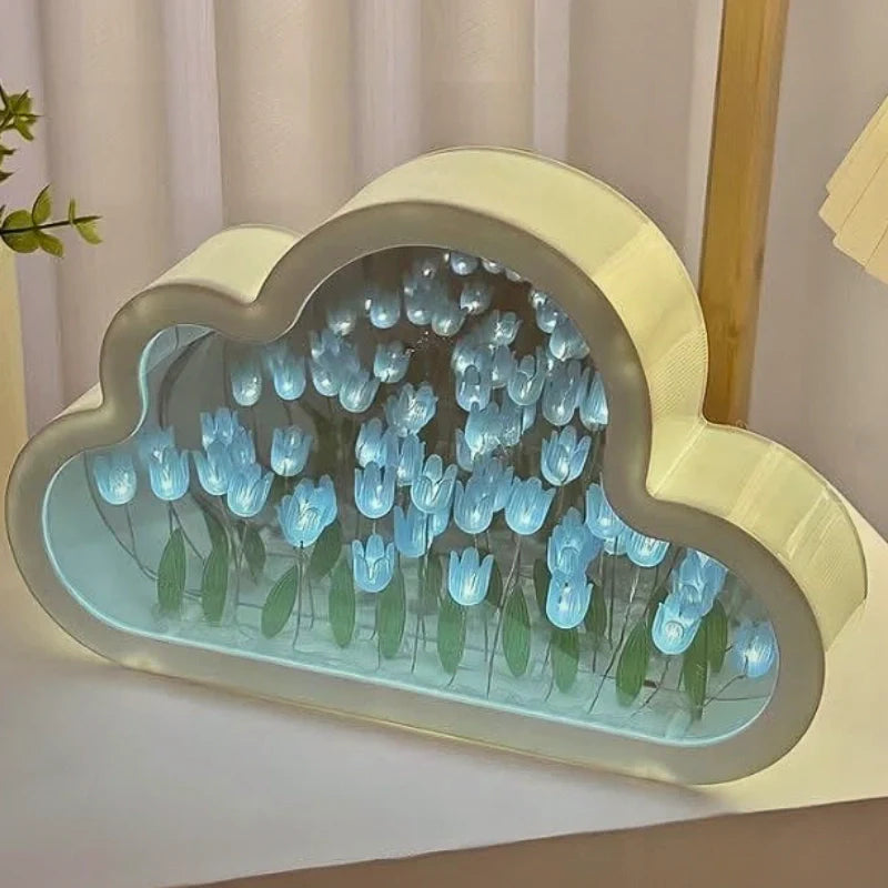 Inspired by the tranquil beauty of drifting clouds and blooming gardens, Bloomfinity™ Eternal Glow brings a touch of poetry to everyday spaces. This cloud-shaped night light cradles a glowing bouquet of tulips, reflected infinitely within its mirrored interior to create a dreamlike sense of depth. Casting a soft, soothing glow, its whimsical silhouette and cordless design bring warmth and charm to nightstands, shelves, or any cozy corner.